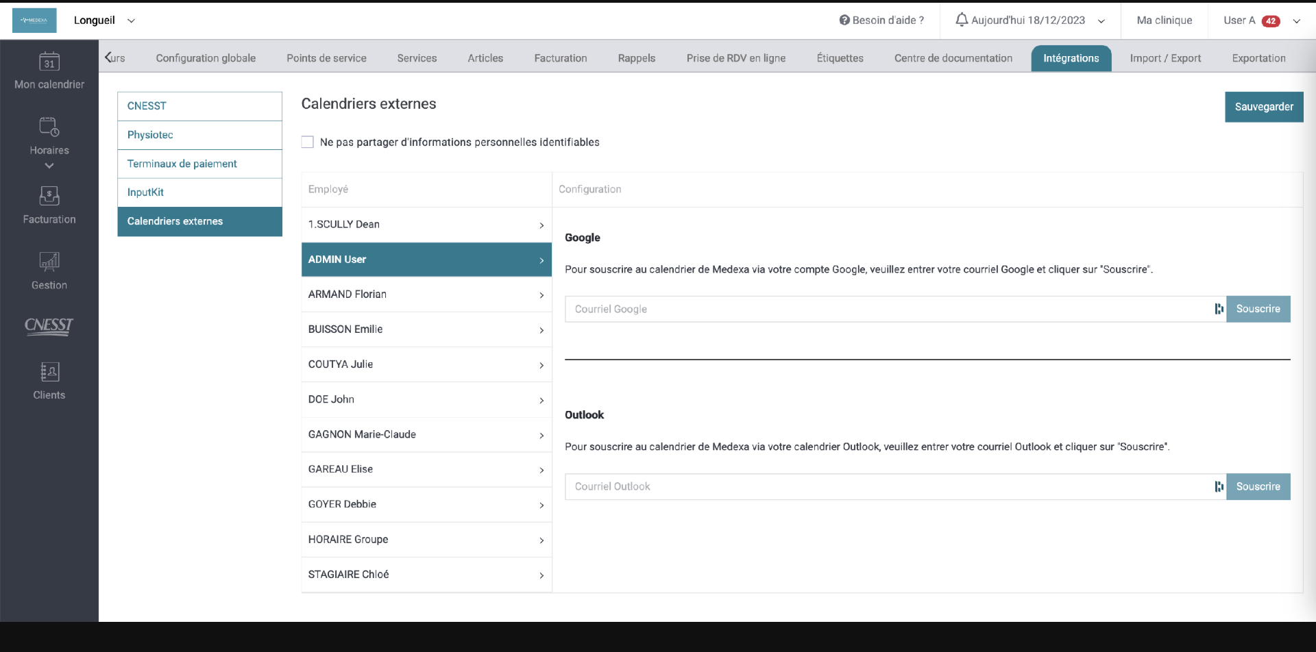 À noter : Si vous donnez le droit d'accés à l'intégration Calendrier externes dans la section Ma clinique. Chaque employé depuis son compte, pourra faire la configuration de son calendrier externe comme présenté ci-dessus. Dans une section nommé Calendrier externes.
